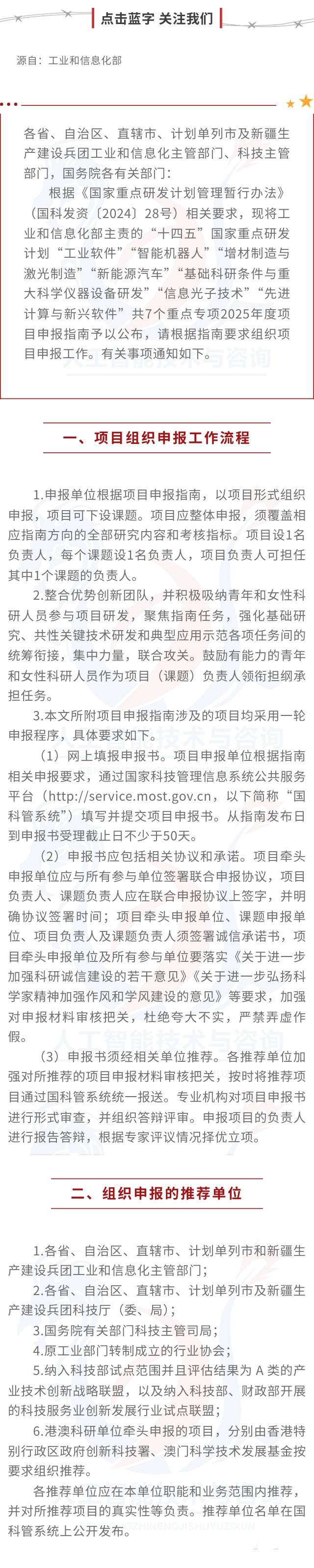 工业和信息化部关于发布国家重点研发计划“工业软件”等7个 重点专项2025年度项目申报指南的通知